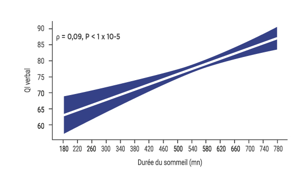 En effet, une relation inverse entre le temps de sommeil et le quotient intellectuel verbal et non verbal apparaît dans certaines études. L’une d’elles, menée sur 2 714 enfants avec des troubles autistiques, indique que les enfants dormant moins de 7 heures par nuit ont un QI moyen, verbal et non verbal, inférieur à ceux dormant plus de 11 heures. Cette donnée n’est toutefois pas confirmée dans tous les travaux.(8)