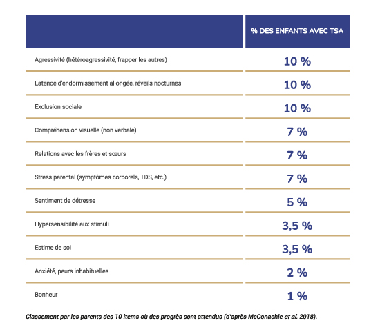Les troubles du sommeil sont associés à un niveau élevé de stress parental et familial et à une diminution de la cohésion familiale (13). Pour les parents d’enfants avec TSA, les problèmes de sommeil sont les symptômes les plus souvent cités par les parents pour leur impact négatif sur la qualité de vie et le fonctionnement quotidien, et pour lesquels ils sont demandeurs d’aide (14).