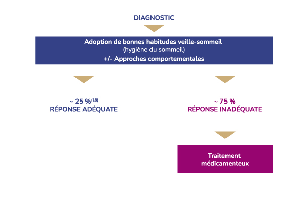 Une prise en charge pharmacologique est indiquée si l’hygiène du sommeil et la prise en charge comportementale des troubles du sommeil ne suffisent pas, ce qui est fréquent (1). Le choix du traitement se fait en fonction du bilan de sommeil, notamment après avoir éliminé d’autres troubles du sommeil associés (comme le syndrome d’apnées du sommeil, syndrome des jambes sans repos), avec la correction d’une éventuelle carence en fer.